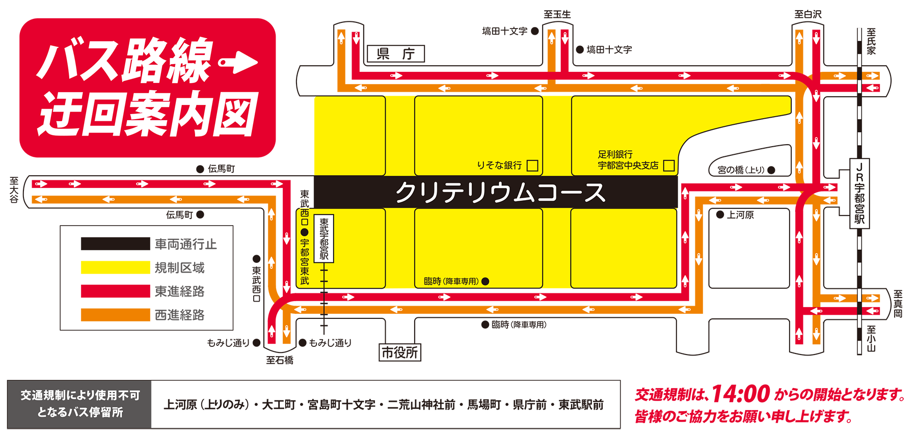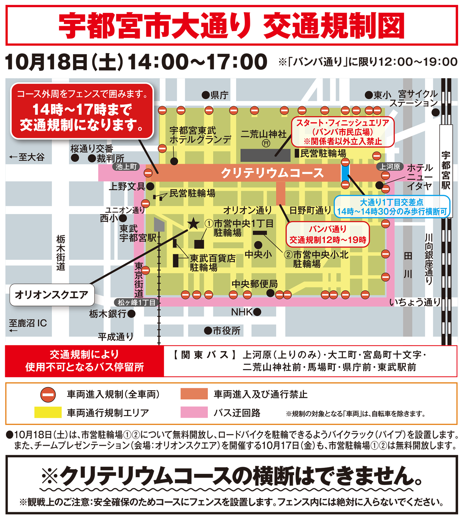 2025宇都宮ジャパンカップクリテリウムの開催に伴い、下記の通りコース沿道を中心に交通規制を行います。ご理解とご協力の程よろしくお願いいたします。