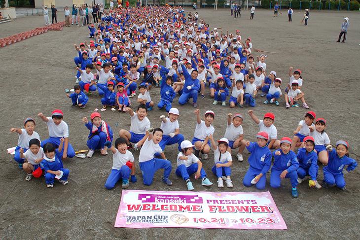 ウェルカムフラワーのプランターに貼られるステッカー 地元から記念大会を盛り上げよう―。25th Excellentプロジェクト第2弾「ジャパンカップウエルカムフラワー」がスタートしました。ロードレース会場となる宇都宮市城山地区の皆さんが大会の象徴となるコスモスを栽培し、育てた花でコースを彩ることで、ジャパンカップに訪れる選手やファンをおもてなしします。ロードレースでは、ツール・ド・フランスにおけるヒマワリ畑の中を選手が走るシーンが有名ですが、ジャパンカップにおいてはコスモスが象徴的な花として広くファンに知られています。記念大会の節目を迎えた今年、城山地区コミュニティ協議会・城山地区連合自治会・城山地区内の小中学校をはじめとした地元が一体となり、コスモス栽培の協力を得られたことでプロジェクトが実現。さらに、株式会社カンセキが趣旨に賛同し、種をはじめ土やプランターを提供していただきました。