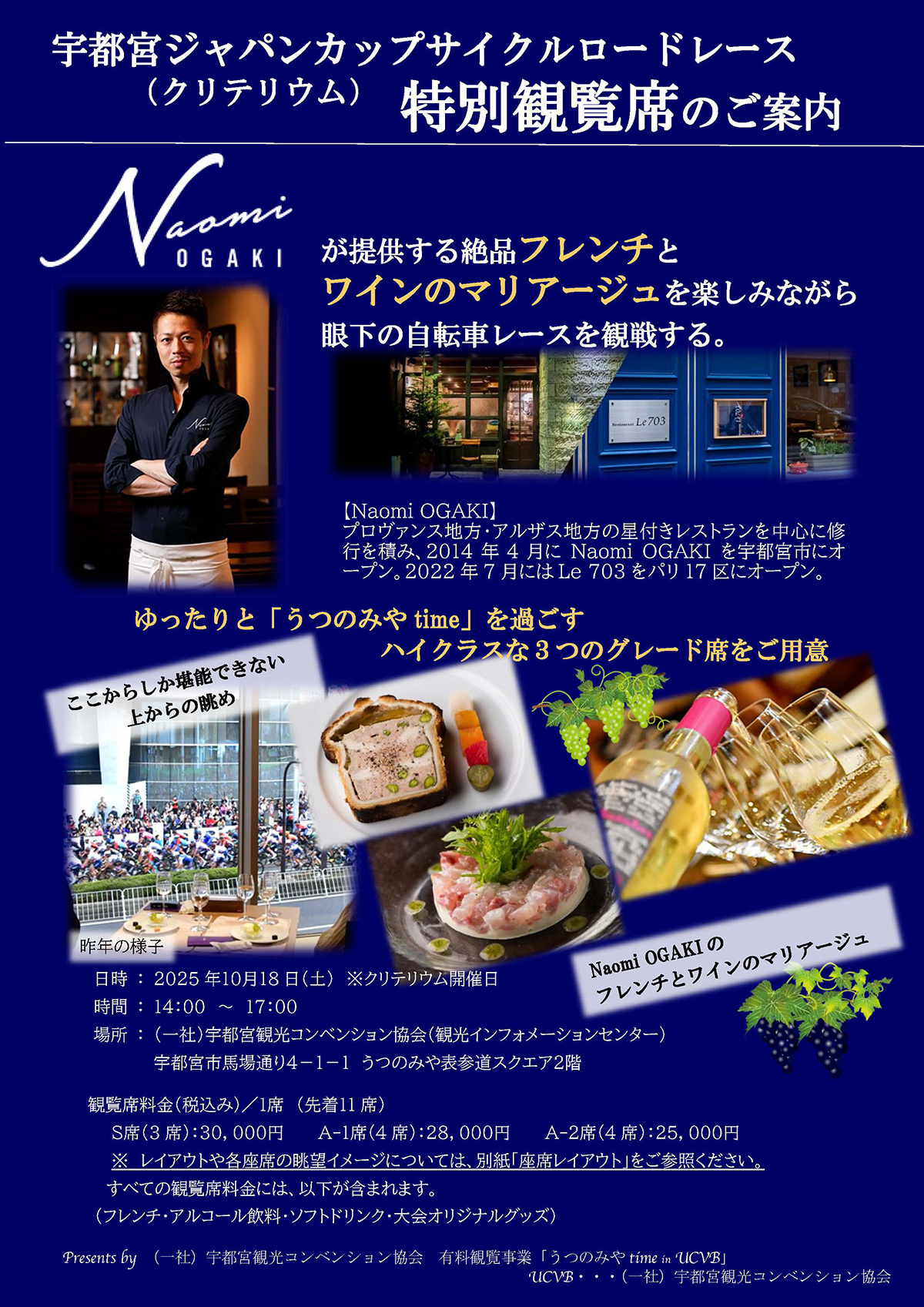 (一社)宇都宮観光コンベンション協会(UCVB)では、昨年に引き続き、2025年10月18日(土)に開催される「2025宇都宮ジャパンカップクリテリウム」において、当協会事務所のスペースを活用し、有料観覧事業「うつのみやtime in UCVB」を実施いたします。