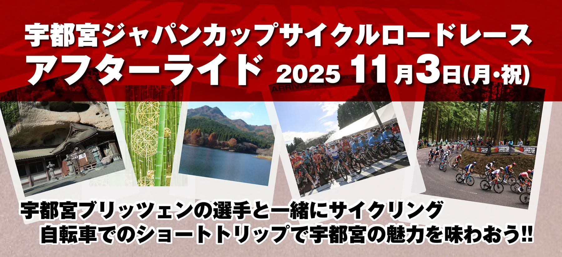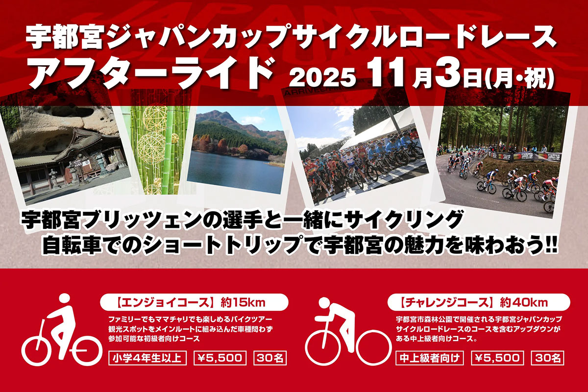 宇都宮ジャパンカップロードレースコースを宇都宮ブリッツェンの選手と一緒にサイクリングしながら宇都宮の魅力を味わう2コース制のライドイベントです。ぜひご参加ください!