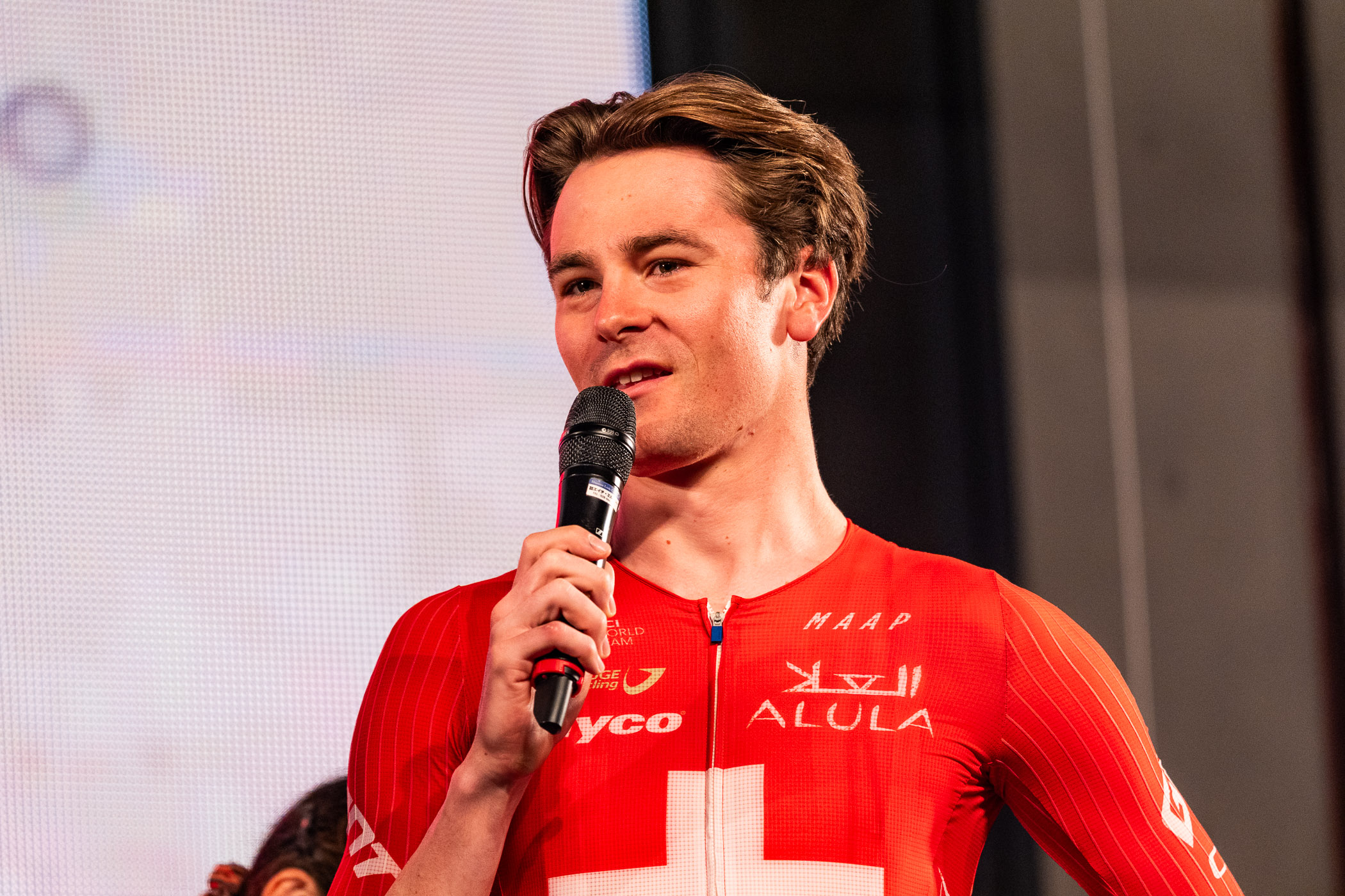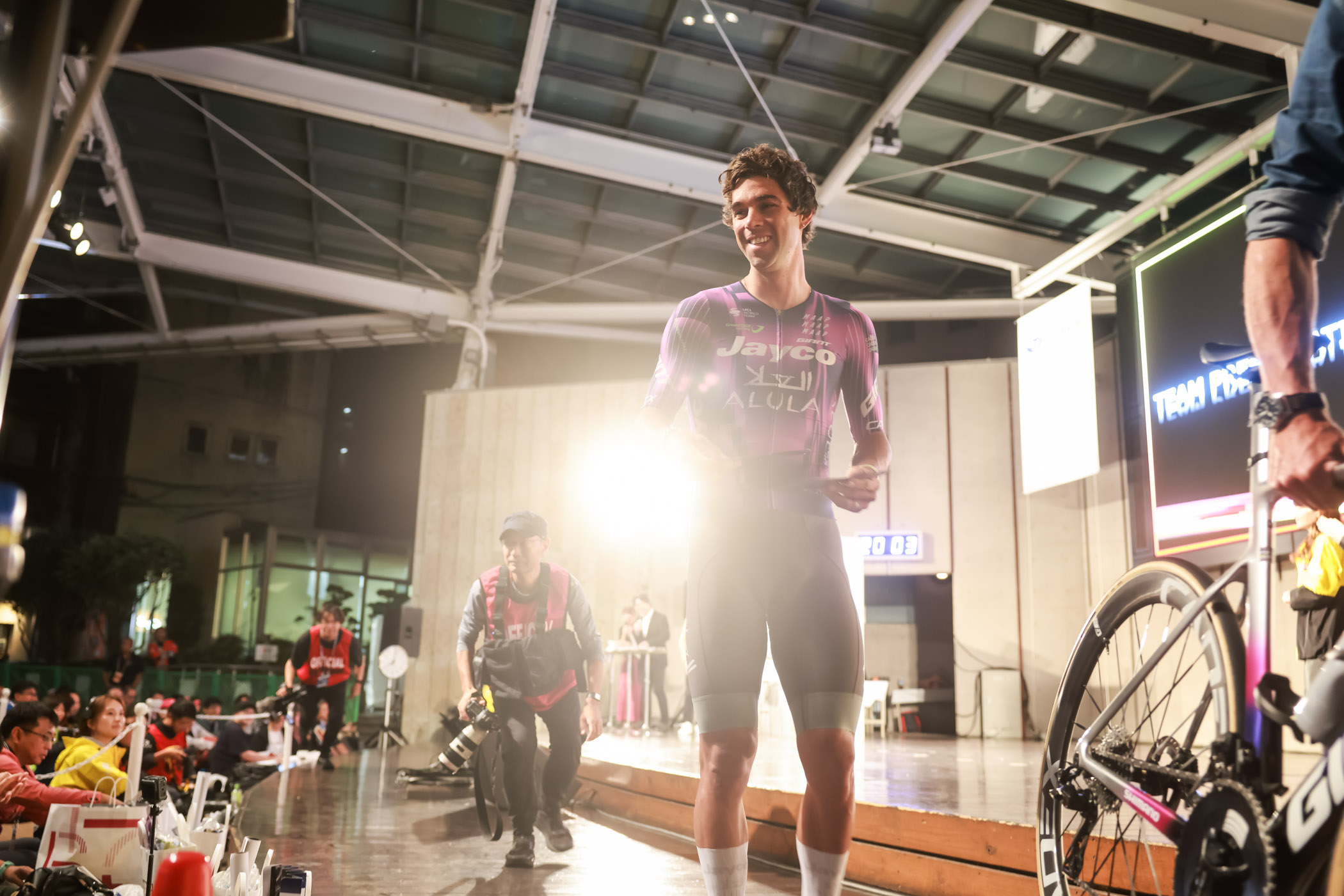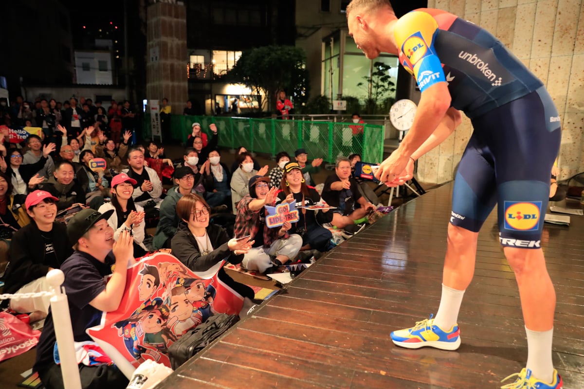 大歓声を受けた留目は「すごく大変なシーズンでしたが、良い経験になりましたし、この舞台で戦うことができて良かったと思います」と今シーズンを壇上で総括。下部育成チームから昇格したコルビー・シモンズはクリテリウムの本場と言えるアメリカで成績を出してきた選手。土日どちらもピンク色のジャージに注目です。