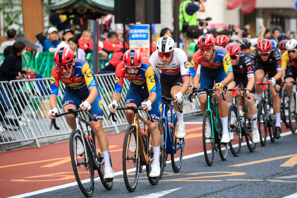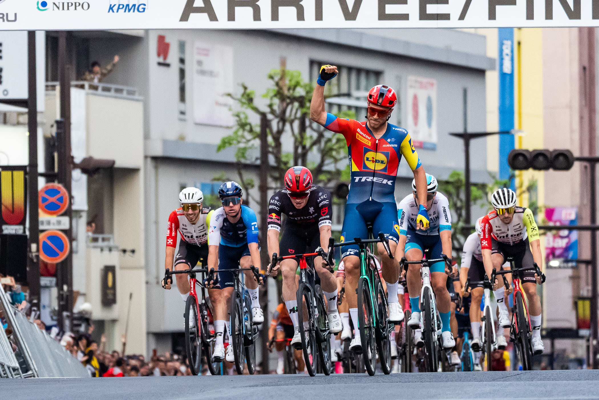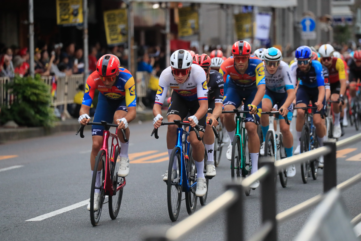 イスラエル・プレミアテックが積極的にアタックを仕掛けるものの、集団前方にメンバーを配置したリドル・トレックがその全てをチェックし、追いかけ、潰していく。メタリックカラーの特別バイクで揃えたトレックのメンバーが、ツール・ド・フランスのマイヨヴェール(ポイント賞)をイメージしたグリーンバイクに乗るミランを勝たせるために、そしてジャパンカップクリテリウムのチーム6連勝を達成するために、徹底的な集団コントロールを続けた。