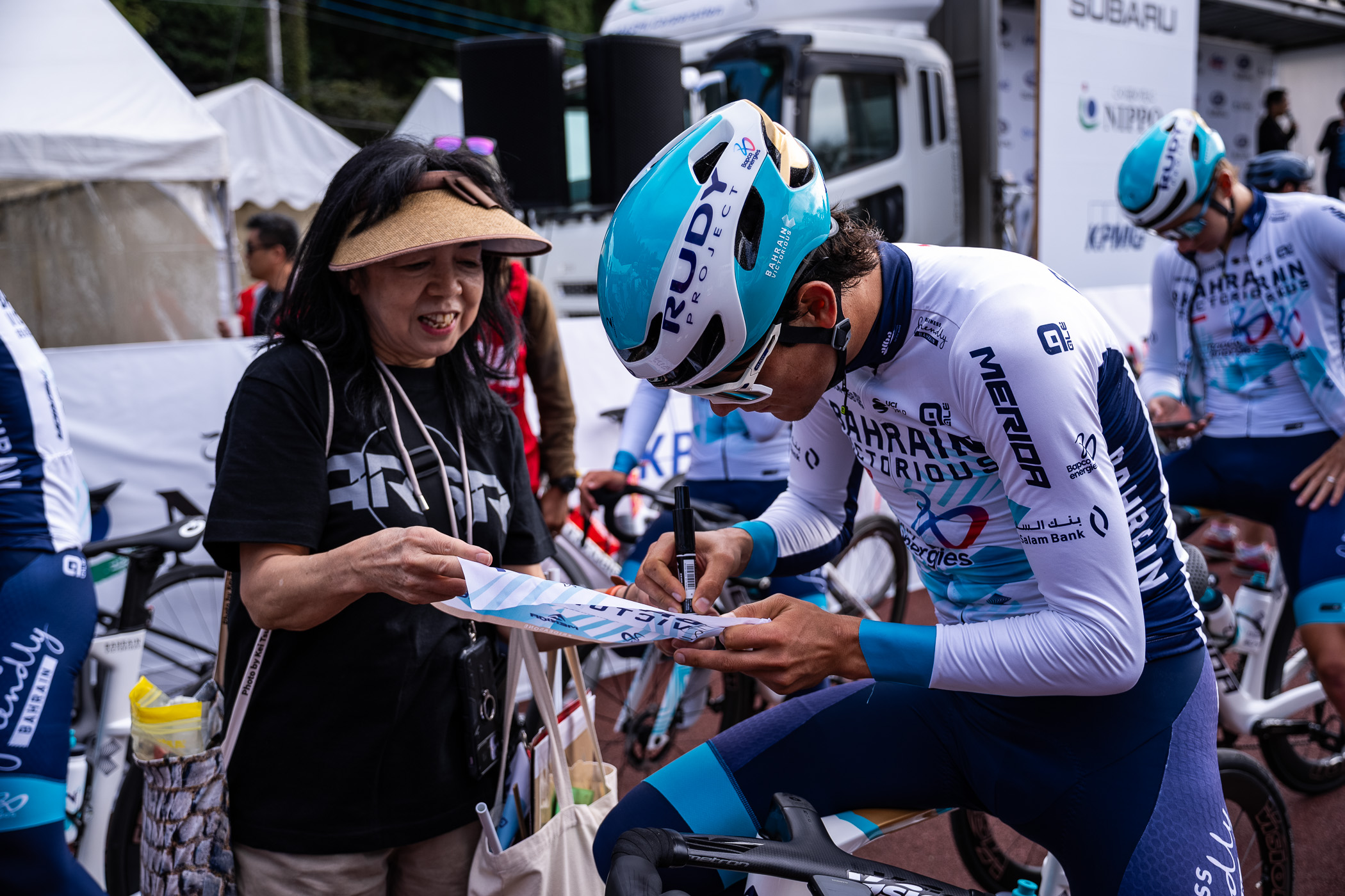日本人は謙虚だから遠慮がちなファンが多いが、選手たちはフレンドリーな笑顔でサービスしてくれる。もちろん自分のチームのジャージを着ているファンにはVIP的な手厚さで応えてくれる。カメラを向けるとファンの肩に手を掛けるマイケル・マシューズ(チーム・ジェイコ・アルウラー)の心遣いがニクイ。
