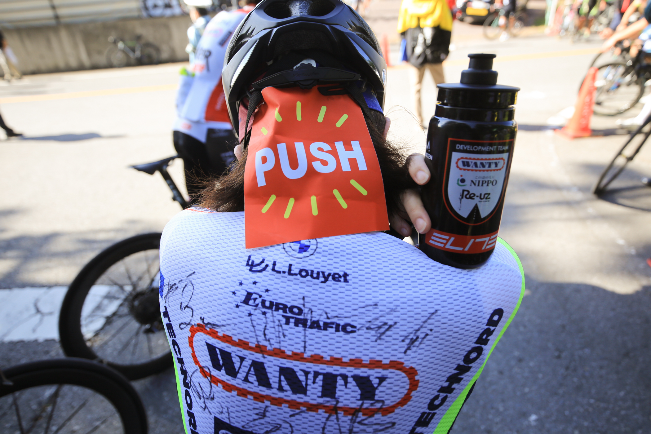 今年はアンテルマルシェ・ワンティのジャージを着て、背中に目立つように「PUSH ME」と大書きしたラベルを貼り付けて走ったファンの女性が目を引いた。その効果もあっていろんな選手に押してもらってフィニッシュにたどり着いた。