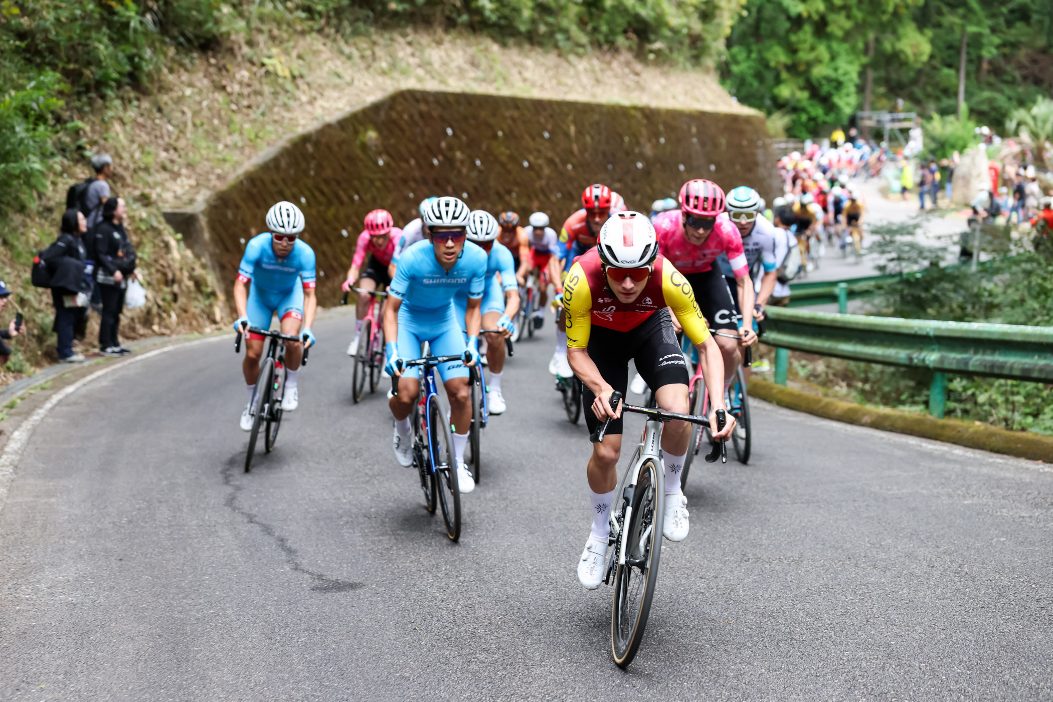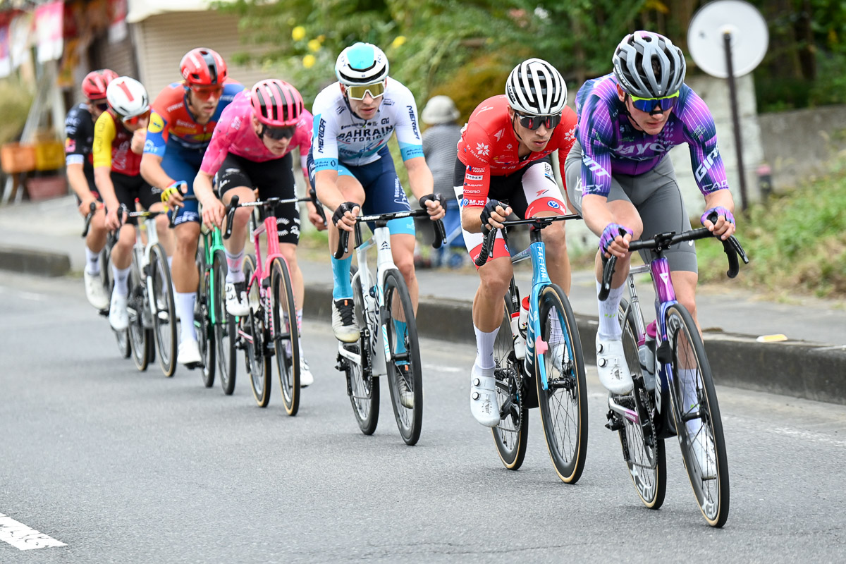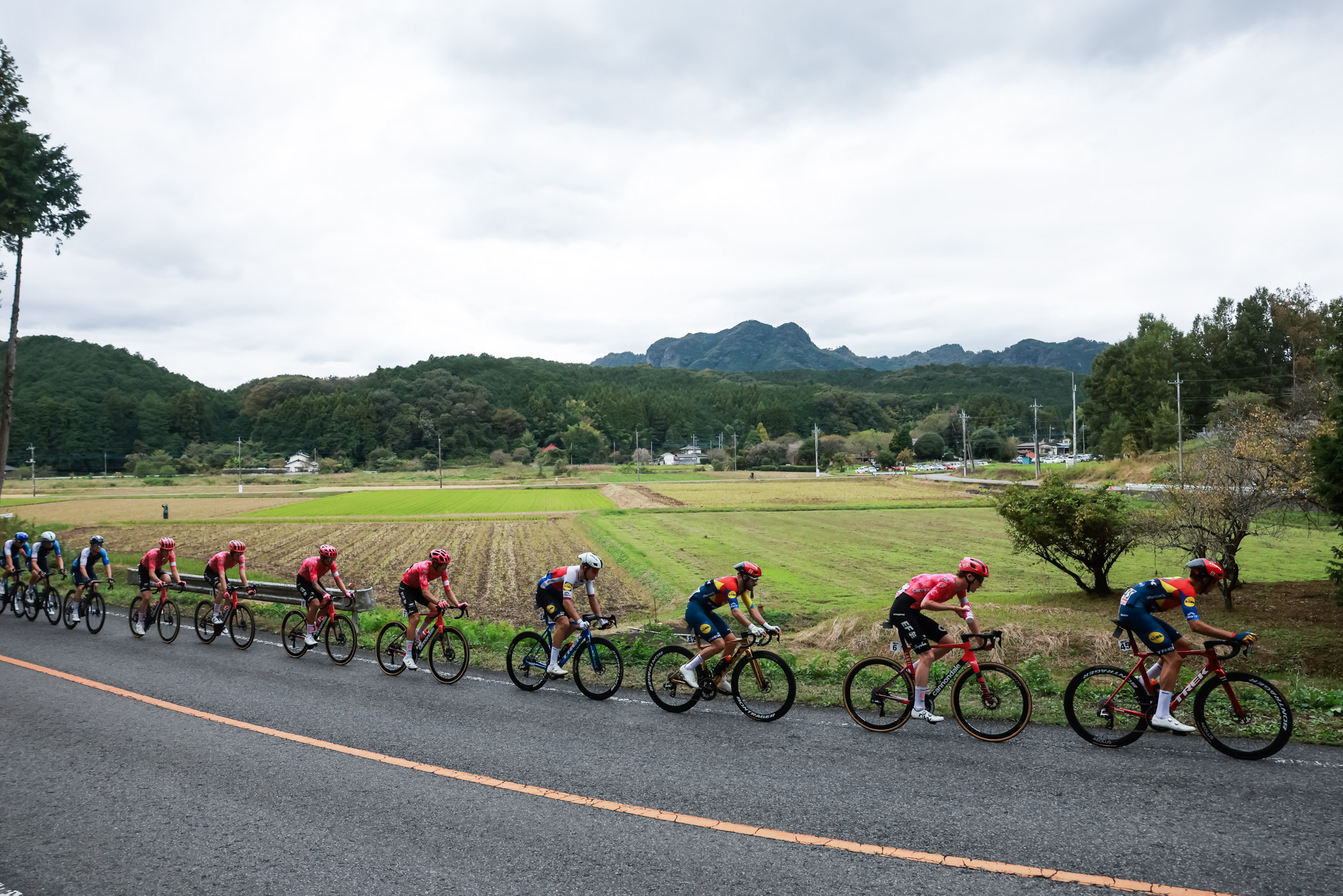 2回目(6周目)の山岳賞を獲ったのはニコロ・ガリッボ(イタリア、TEAM UKYO)。34名の集団はまとまるはずもなくアタックと吸収が続く。その後ろの追走グループからは、キリロ・ツァレンコ(ウクライナ、ソリューションテック・ヴィーニファンティーニ)やベンジャミン・ダイボール(オーストラリア、ヴィクトワール広島)、岡篤志(Astemo 宇都宮ブリッツェン)、サイモン・クラーク(オーストラリア、イスラエル・プレミアテック)の4名が望みを繋ぎながら追いかける。