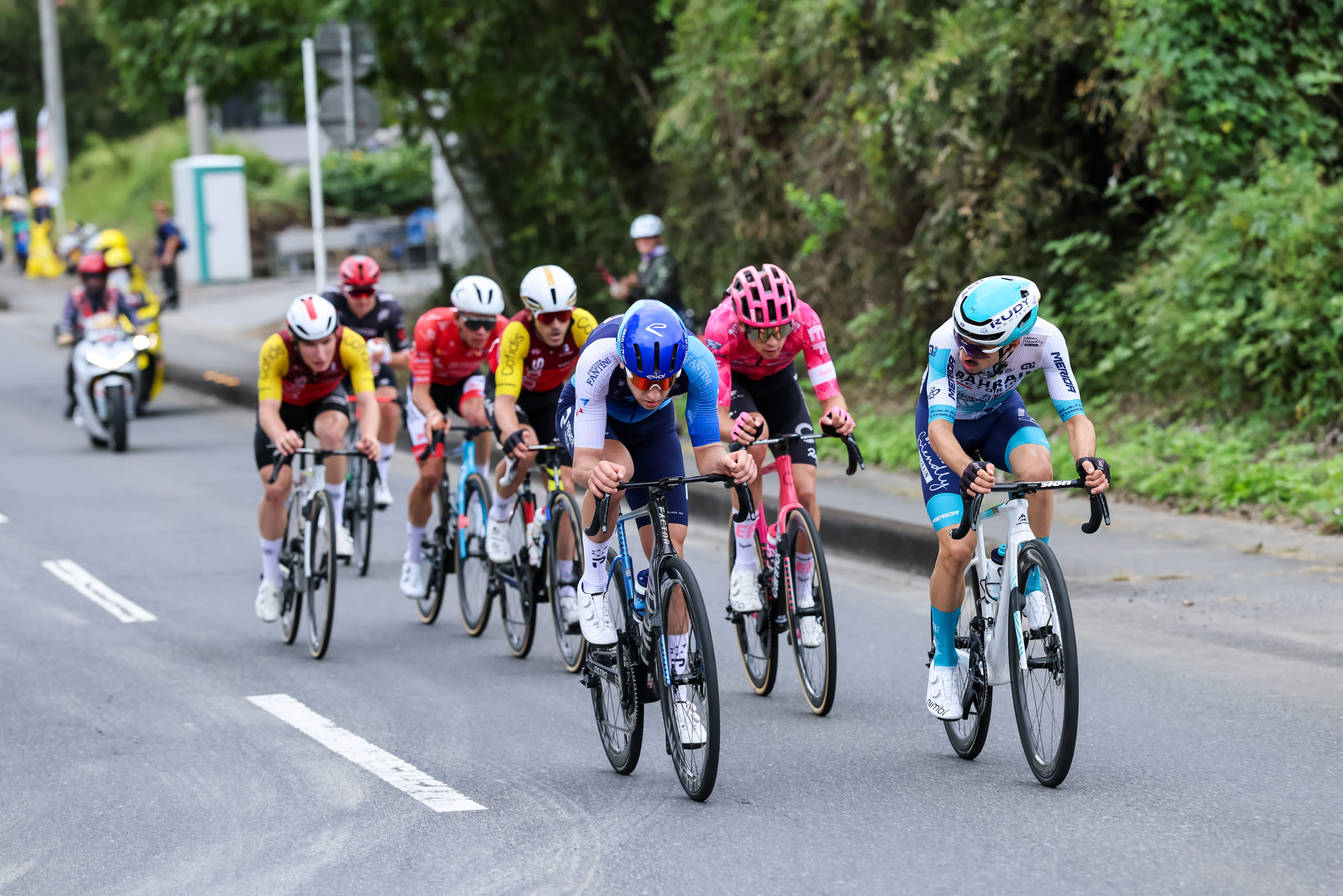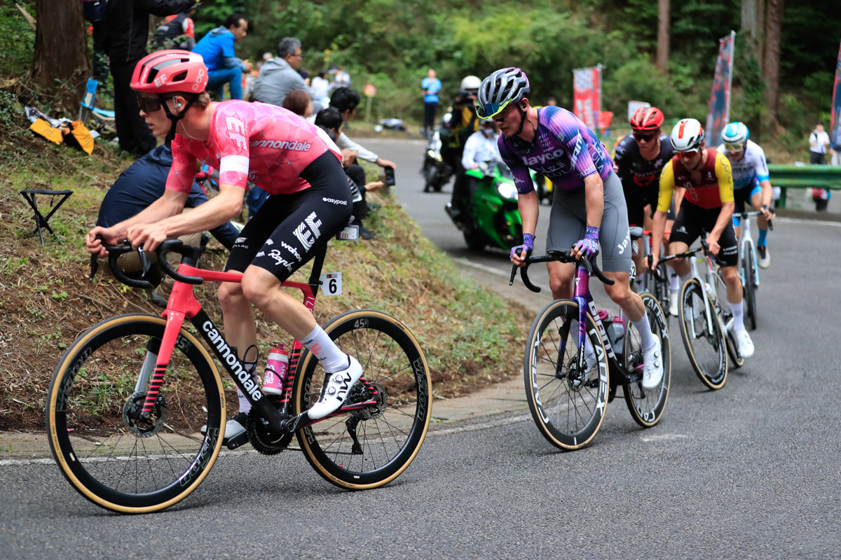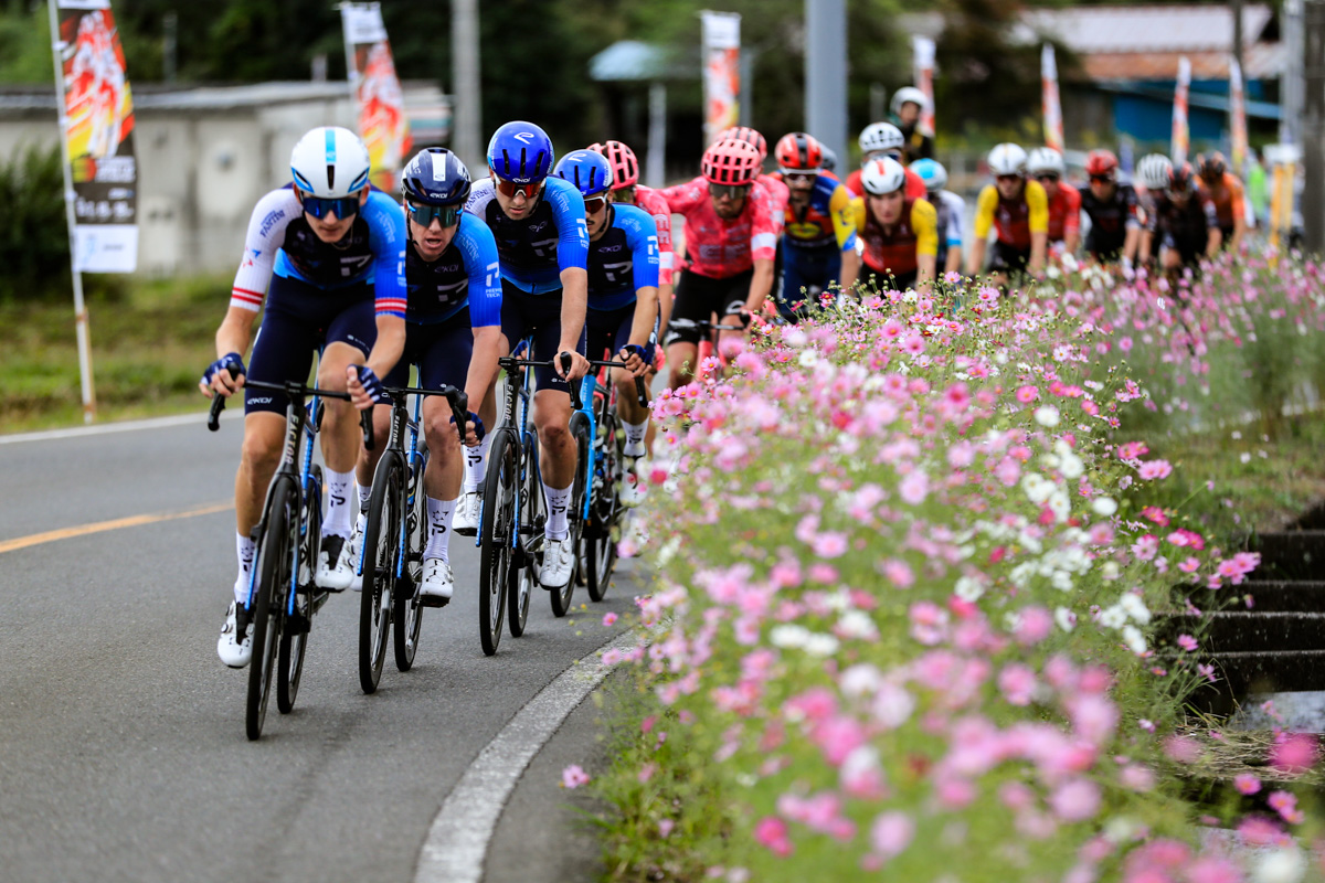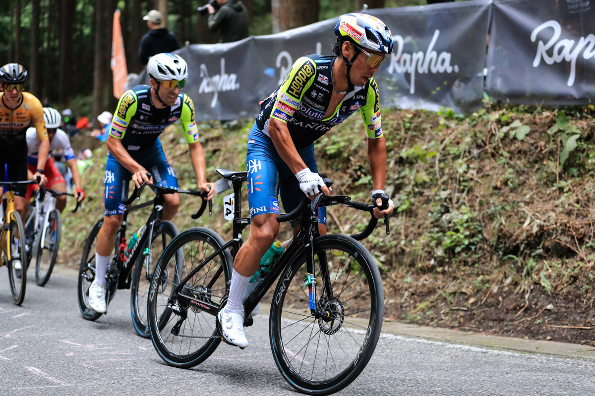 2回目(6周目)の山岳賞を獲ったのはニコロ・ガリッボ(イタリア、TEAM UKYO)。34名の集団はまとまるはずもなくアタックと吸収が続く。その後ろの追走グループからは、キリロ・ツァレンコ(ウクライナ、ソリューションテック・ヴィーニファンティーニ)やベンジャミン・ダイボール(オーストラリア、ヴィクトワール広島)、岡篤志(Astemo 宇都宮ブリッツェン)、サイモン・クラーク(オーストラリア、イスラエル・プレミアテック)の4名が望みを繋ぎながら追いかける。