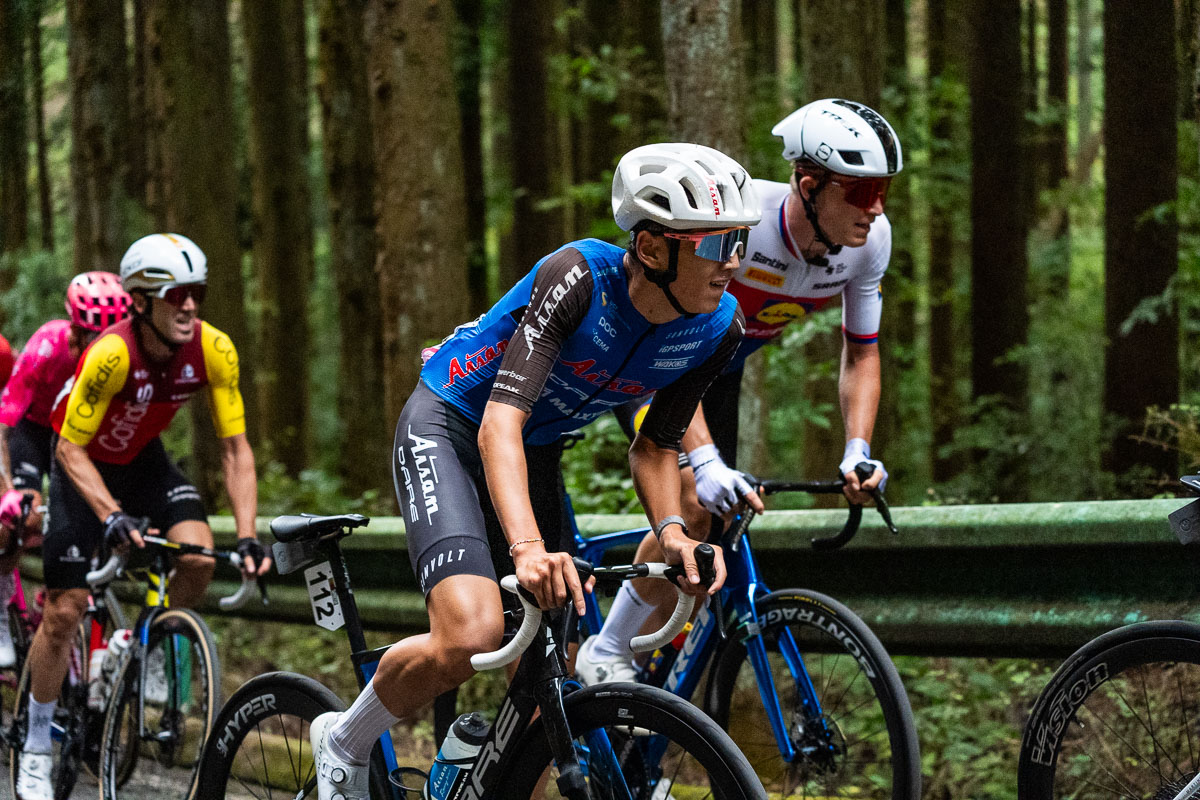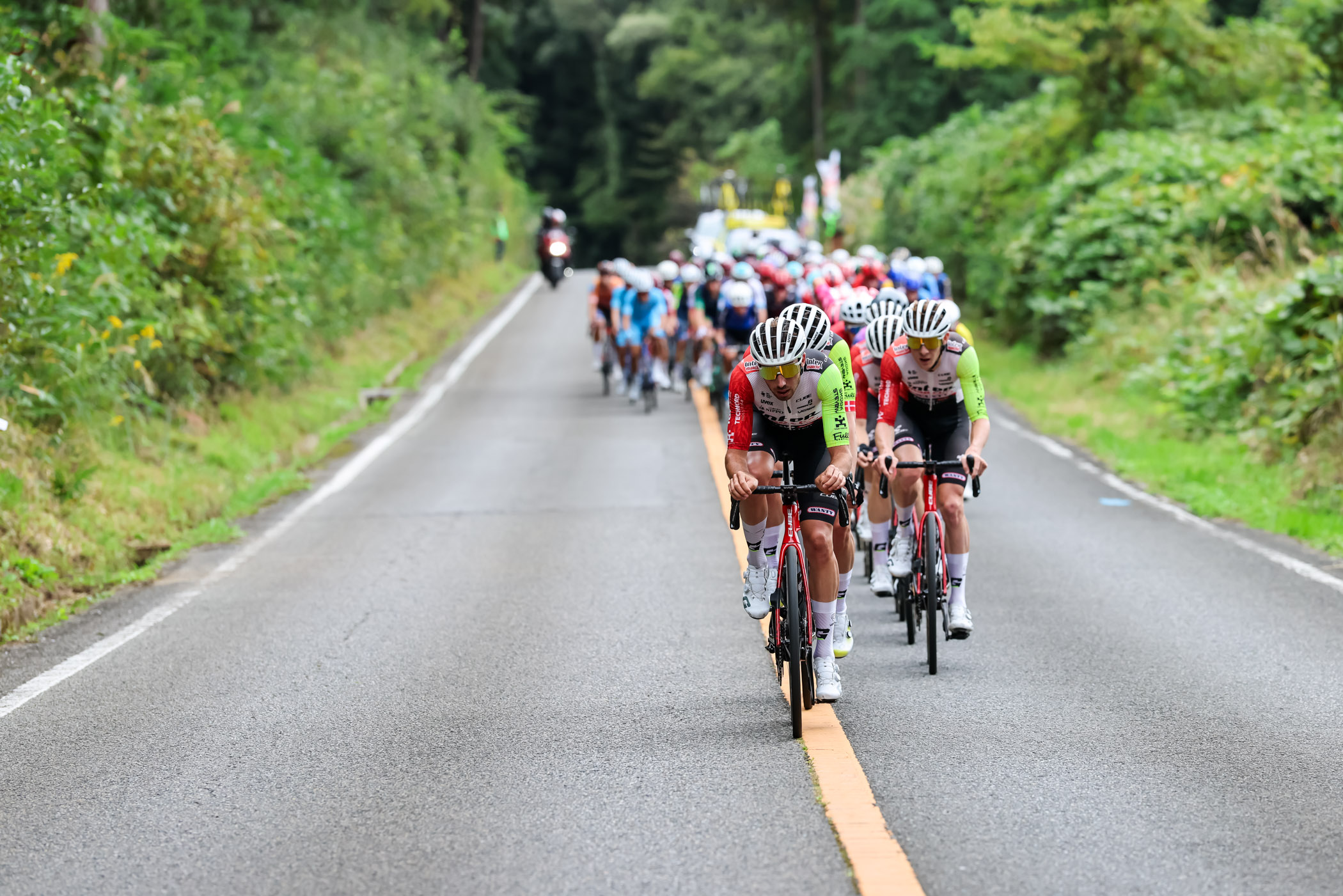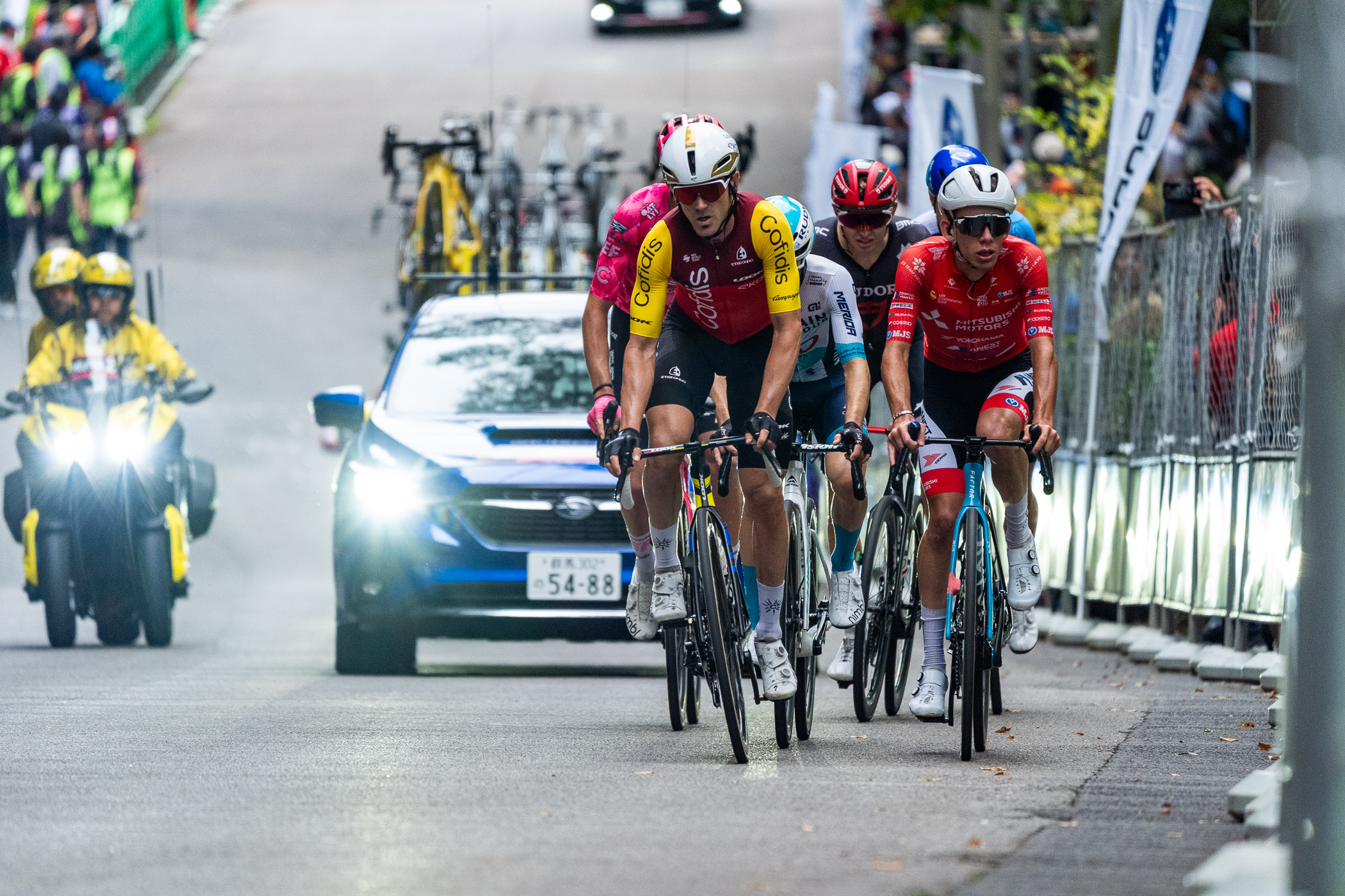 シマノ勢が人数を固めた集団先頭からファーストアタックを掛けたのはサム・メゾノブ(フランス、コフィディス)。最初の古賀志林道の登りからハイペースで進み、その後のテクニカルな下りで、ゲオルグ・シュタインハウザー(ドイツ、EFエデュケーション・イージーポスト)やクリテ勝者ジョナタン・ミラン(イタリア、リドル・トレック)を含む6名が先行。4つのワールドチームが逃げに乗ったことでスピードを押さえたメイン集団からは、後手を踏みたくないTEAM UKYOのシモーネ・ラッカーニ(イタリア)が飛び出した。