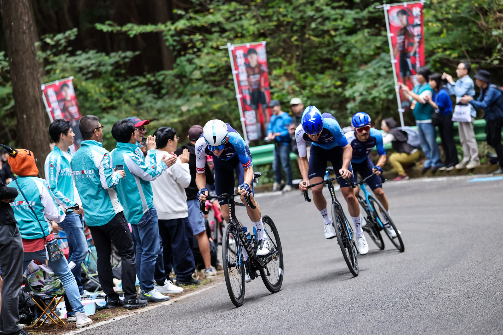 古賀志林道で3周回連続アタック。「トップスピードで登っていてもなおレニーの方が速かった」と振り返るイサギレたちを振り切って、22歳のクライマーが10秒リードで頂上を越える。ボーダンとイサギレがローテーションを回しながら追いかけたものの、ビッグギアを踏むマルティネスは1秒、また1秒とリードを少しずつ上積みしていく。コース後半のアップダウン区間でリードを広げたマルティネスが、最終的に32秒リードでフィニッシュラインに飛び込んだ。