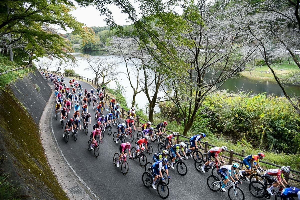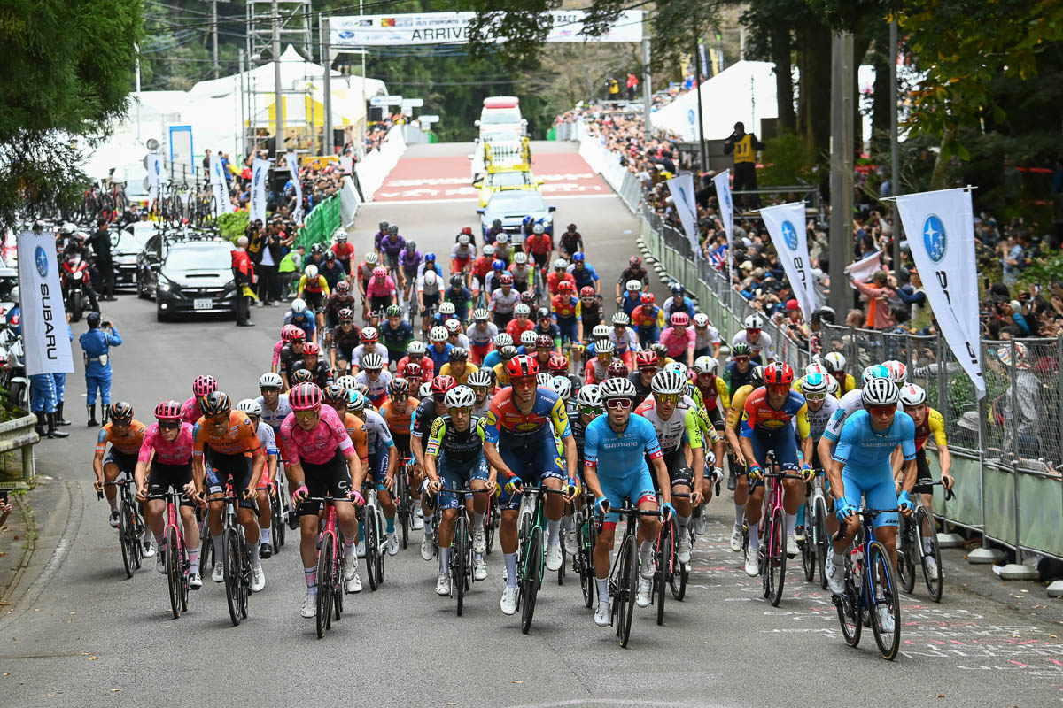 宇都宮森林公園の特設コースは曇りながら、半袖でも問題ないほどの暖かさ。レースコースは幾多の名勝負を生み出してきた古賀志林道(釣堀〜頂上間1.14km/平均勾配8.4%)を含む1周回10.3kmのコースを合計14周する144.2kmで、獲得標高は2,660m(1周回当たりの獲得標高は190m)に及ぶ。この日はスタート直後の古賀志林道でいきなりワールドチーム勢が動いた。