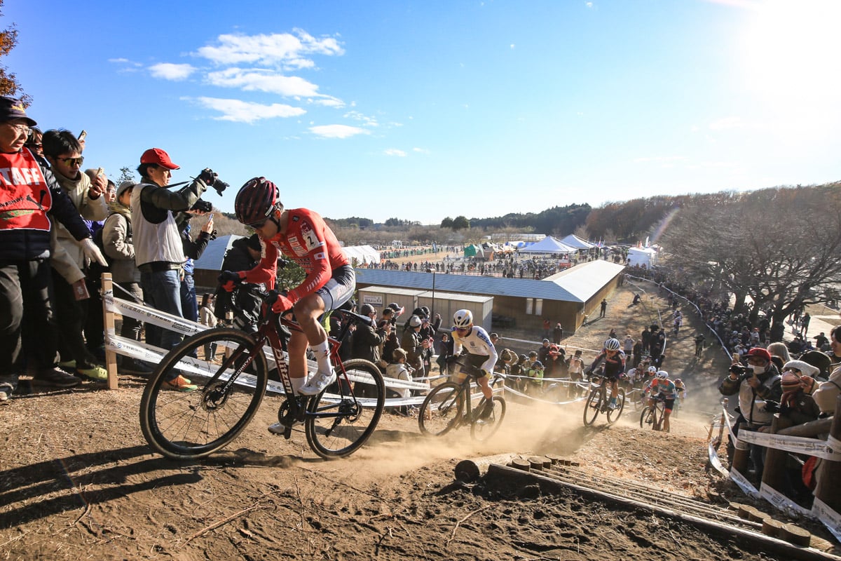 シクロクロスはオフロードの周回コースで行われる自転車レース。コースには人工の障害物が設けられ、ロードレースと違った楽しみを味わえるスポーツです。自転車を漕いで、担いで、ホップして。コンパクトなコースを短時間で周回するので、応援するほうも休むヒマ無しの興奮の連続!